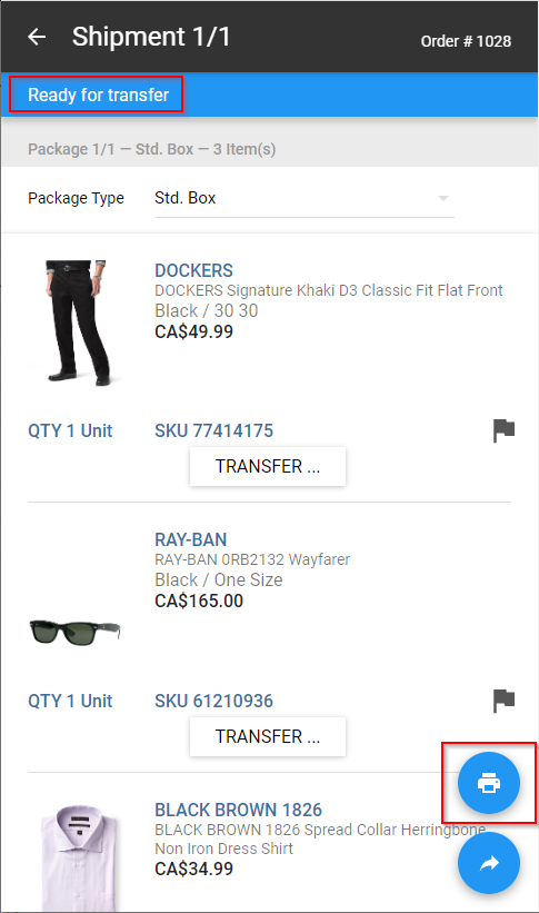 Pickers can now access shipment documents, such as shipping labels, during the fulfillment of transfers shipments. Documents are accessed via the Print documents command icon when shipments are in state Ready for Transfer, allowing retailers to exploit carriers to transfer packages between stores.